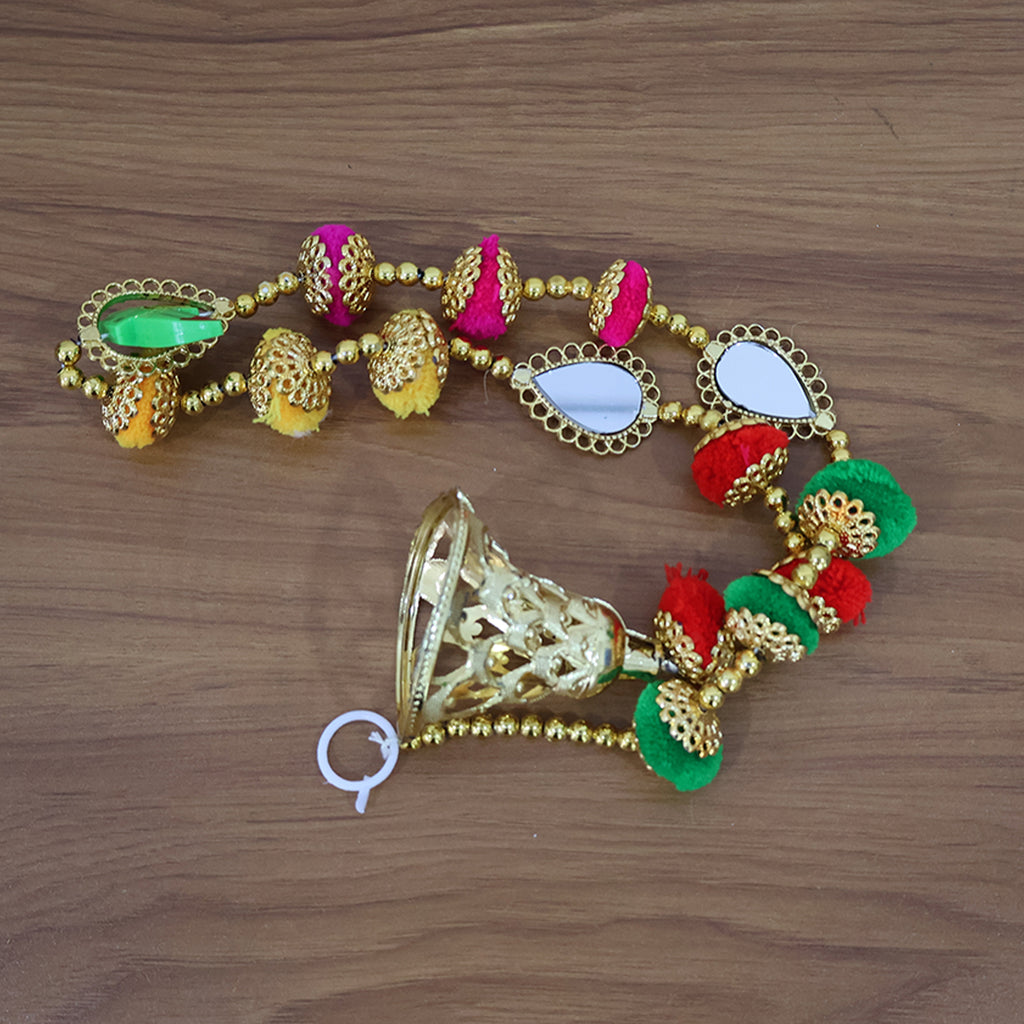 This vibrant and traditional decorative hanging is designed to add auspiciousness and festive charm to your home or workspace. Crafted with colorful pompoms, golden beads, mirror embellishments, and a unique parrot motif, it also features a golden bell at the bottom, symbolizing positivity and prosperity. Perfect for hanging on doors, walls, pooja rooms, and temples, it enhances the spiritual ambiance of any space. Its bright design and cultural symbolism make it an ideal décor piece for festivals, housewarming ceremonies, and special occasions, while also serving as a thoughtful gift.